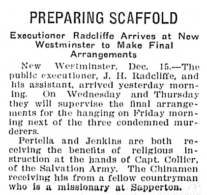 This makes three prisoners to be executed on December 18—Pertella, a negro, for murdering Mrs. Jenkins, a negro woman of Vancouver; Jenkins a mulatto, for murdering Mrs. Morrison of Hazelmere, and also Lee Chung.